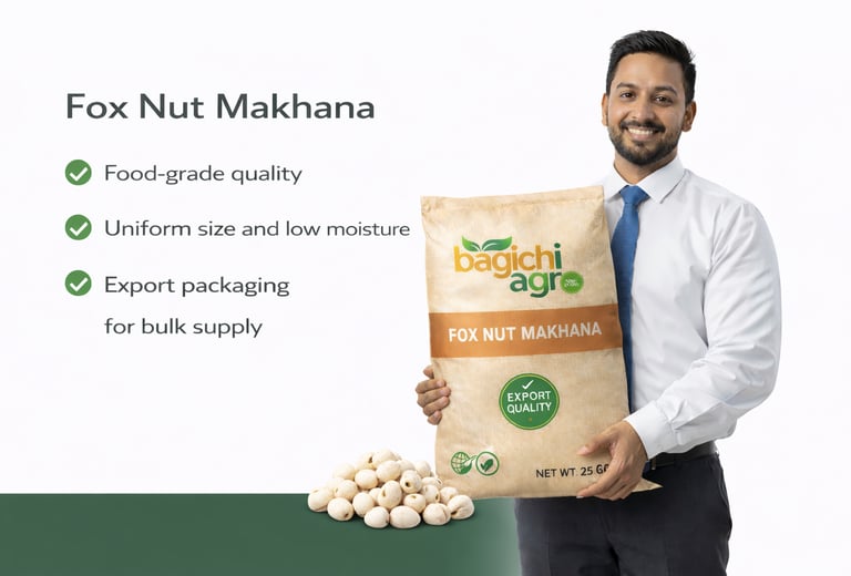 Bagichi Agro specializes in the export of high-quality fox nut (makhana) sourced from trusted producers and processed under controlled conditions to meet international food safety and quality standards.